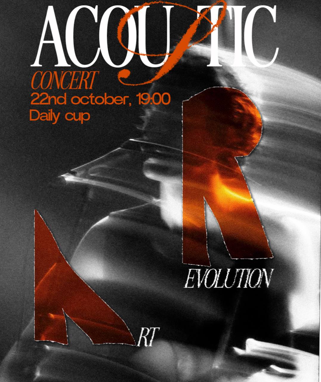 Acoustic. Постер для акустического вечера. Акцентный оранжевый цвет передает расслабляющую функцию вечера, напоминающий приятную посиделку камина после тяжелого дня. Заглавные буквы в названии организатора задерживает на себе внимание зрителя.